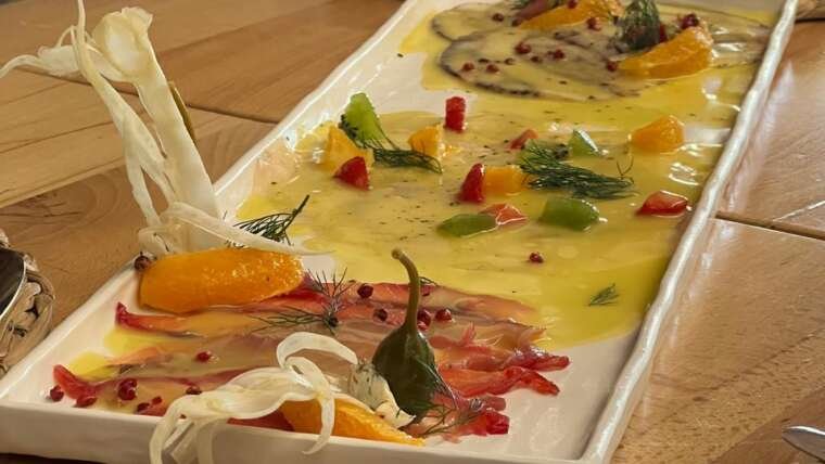Salmon, Green Apple Puree, Lime, Olive Oil, Mix Green Herbs